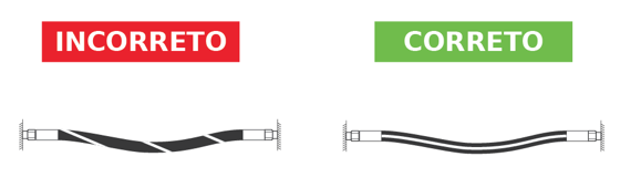 Torção: A pressão aplicada em uma mangueira hidráulica torcida pode encurtar a sua vida útil ou afrouxar as conexões. Para evitar torções, a marcação da mangueira hidráulica pode ser usada como uma referência, a faixa de marcação da mangueira deve estar paralela. A torção também pode ser evitada com o uso de duas chaves durante a instalação.